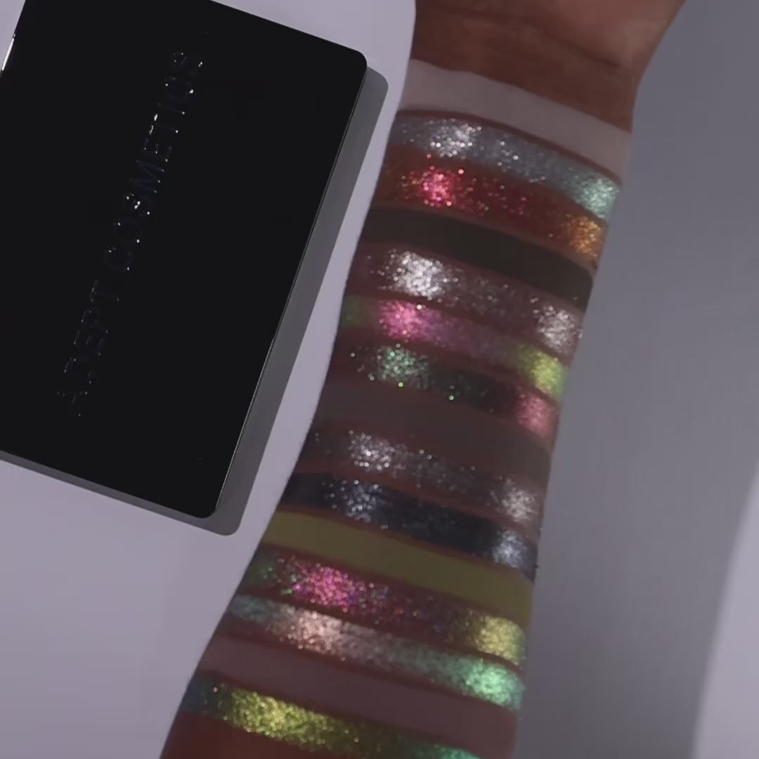 Ingredients: Silver Fang, Graveyard Jade, Glitch Serpent, Oracle, and Toxic Foam are pressed pigments (not safe for eye use in the USA. Safe for eye use in Canada, EU and Asia) Mica, Talc, Silica, Diisostearyl Malate, Magnesium Stearate, Polymethyl